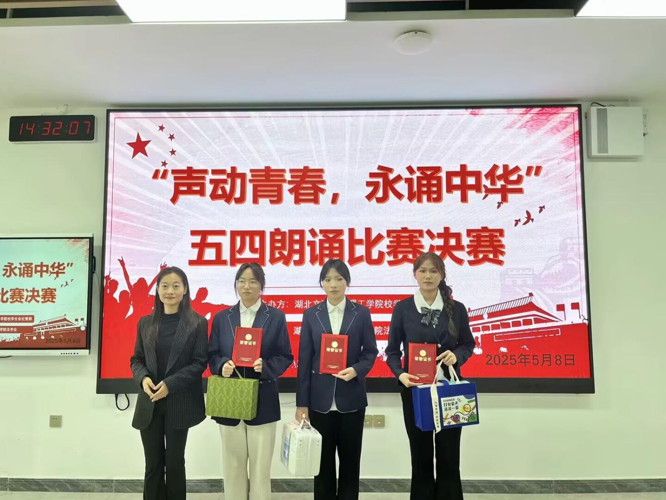 经过初赛的激烈角逐,最终4组选手脱颖而出,会师决赛,为现场观众带来一场精彩纷呈的视听盛宴。选手们围绕“青春”“奋斗”“爱国”等主题,深情朗诵了《青春中国》《五四魂》《闪耀吧!青春的火光》《谁是最可爱的人》等经典作品。他们或慷慨激昂,或娓娓道来,通过铿锵有力的语言和饱满的情感,展现了新时代青年对历史的铭记、对祖国的热爱以及对未来的憧憬。经评委们打分,《五四魂》朗诵组荣获一等奖,《闪耀吧!青春的火光》朗诵组荣获二等奖,《青春中国》朗诵组荣获三等奖。