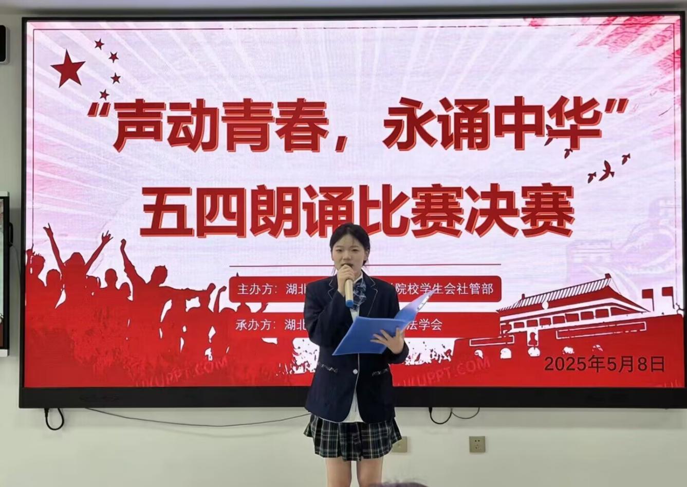 (通讯员 王青)五月的春风携来青春回响,铿锵的诵读激荡时代新声。为纪念“五四运动”106周年,弘扬爱国主义精神,激发青年学子的青春力量,法学会于5月8日下午在东津校区一教413教室举办“声动青春,永诵中华”五四朗诵比赛决赛。由社团指导老师蒋隽雅和优秀学生干部陈腊英、刘倩担任此次比赛的评委。