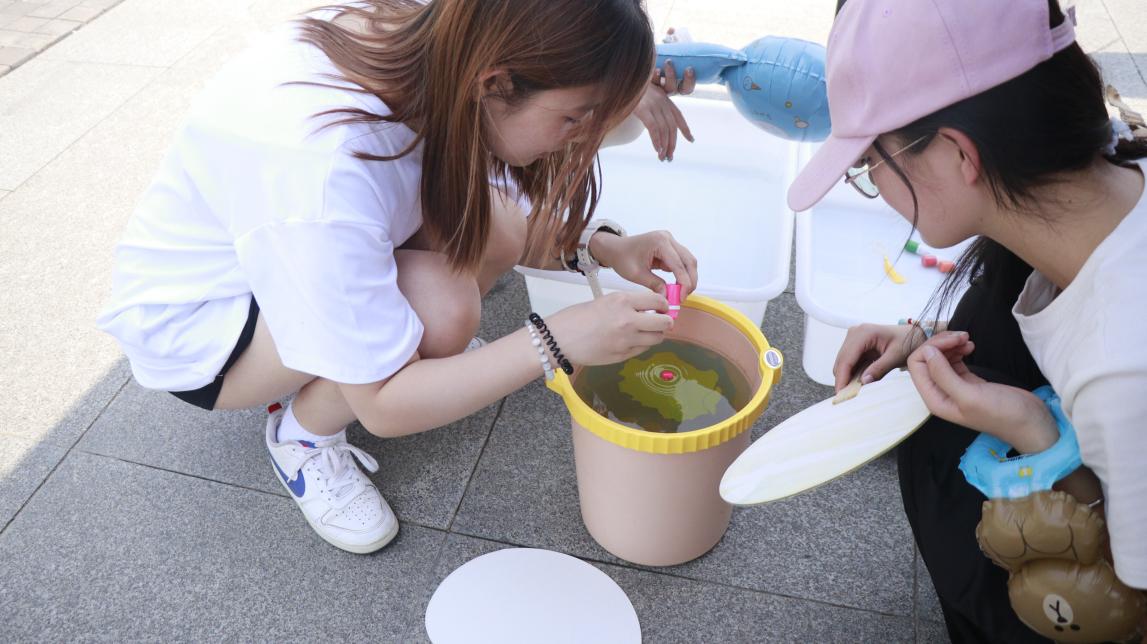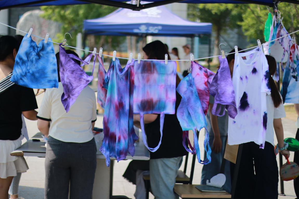 福流实验室(E站):在扎染体验区,同学们亲手完成布料捆扎、染色到晾晒的全过程,于专注创作中感受“心流”的沉浸魅力。