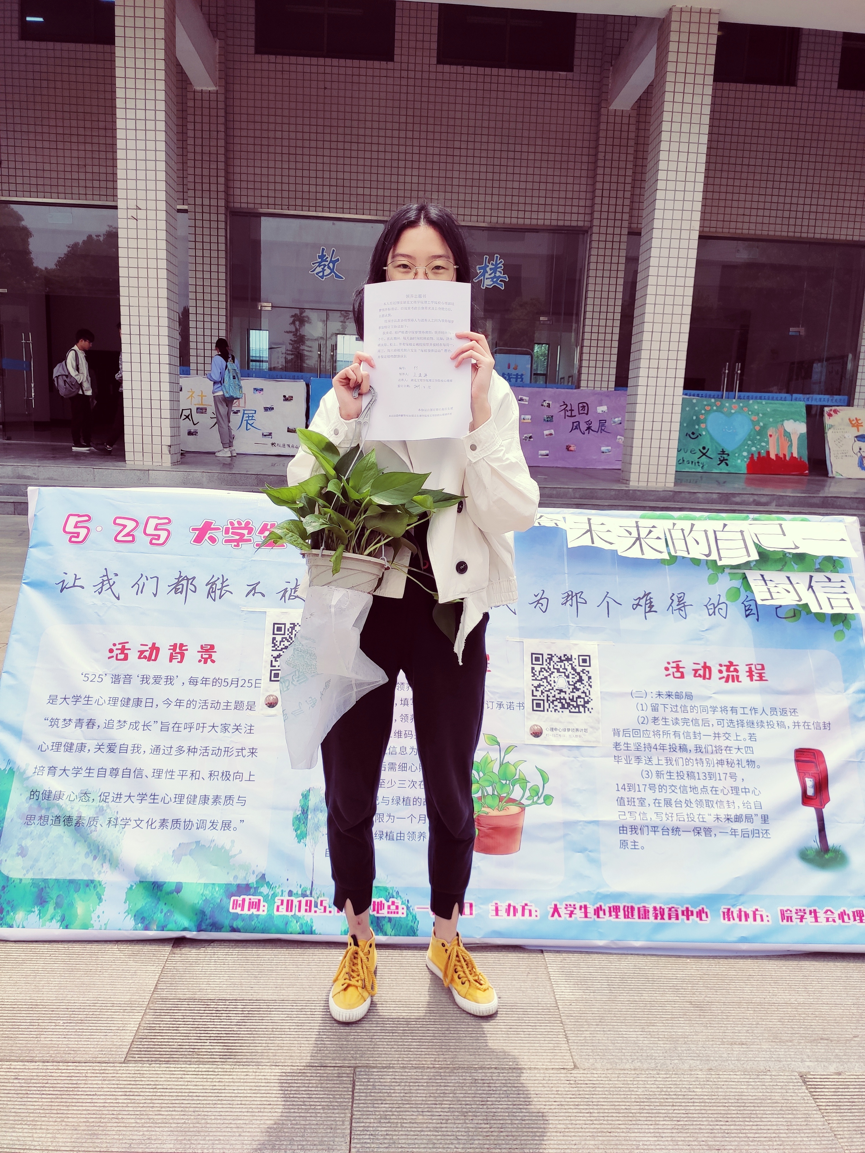 由校心理部和心理健康协会承办的“绿植领养”活动首先开始,活动旨在通过领养和照顾绿植的方式,用付出去感受生命的成长过程,培养自己的爱心和耐心。大家只需要填写一张《绿植领养书》,加入活动QQ群,便可免费领取一盆绿植,要求每天抽时间照顾植物,比如:浇水、晒太阳、松土、带着绿植走遍校园等,并且每周至少三次在群里分享自己与绿植的故事.