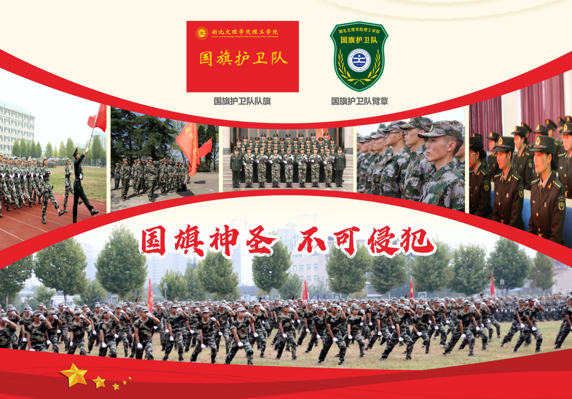 我们国旗护卫队成立于2016年10月,是由退伍返校学生高度发起建立的,队员们在校每天坚持准军事化训练。国旗护卫队成立以来,得到了学校各大专业学生的爱戴与拥护,经过严格挑选,每年保持队员30名左右。国旗护卫队担负着每周升旗、重大活动仪仗队、2017-2020我们新生军训、全校国防知识教育等任务,多次应邀走出校门为襄阳市中小学表演升降国旗仪式、开展国防教育讲座等,我们国旗护卫队不仅是理工校园内一道亮丽的风景,也在襄阳市小有名气,被襄阳日报、襄阳晚报、楚天快报、汉江网等各大媒体争相报道,称赞他们“不是军人、胜似军人”“青年的典范”“自我教育、自我管理的标杆”等。