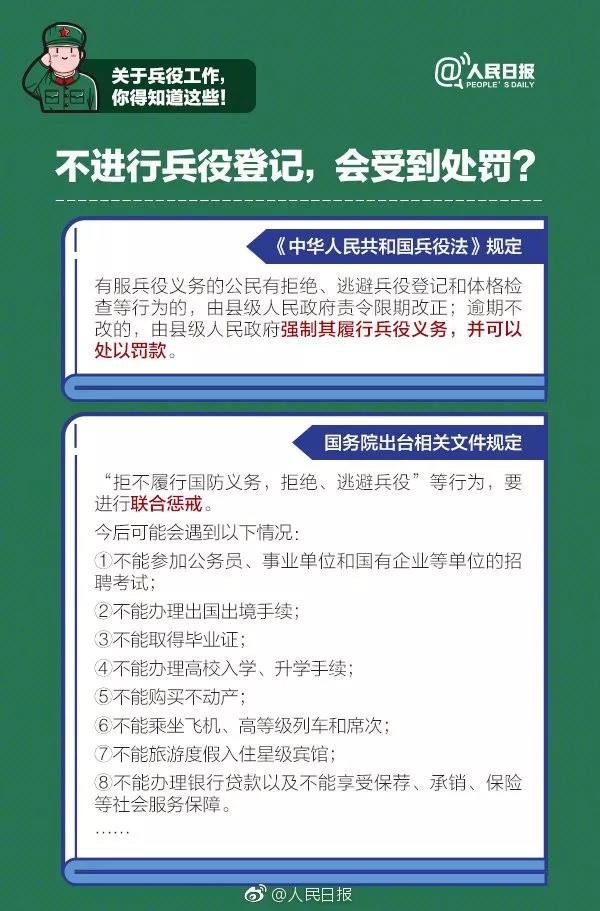 5.被列入征信“黑名单” 山西省去年下发的兵役登记通告中规定,拒绝、逃避兵役登记属严重失信行为,对拒不履行兵役义务行为,实施限制购买不动产(就是不让你买房!)、贷款、乘坐飞机与高等级列车等综合性约束惩戒。