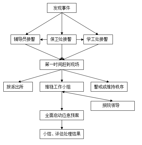 3、涉稳事件的处理方案。学院安全稳定工作领导小组本着“先控制,后处置,维护学生利益、减少损失”的原则,果断处理,积极指导、组织现场人员离开危险区域,保卫学校贵重物品,维护现场秩序,做好事故现场保护工作,上报学院突发事件有关材料,做好善后处理工作。
