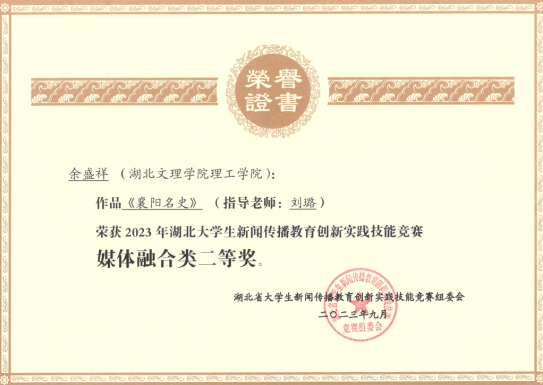近日,2023年湖北大学生新闻传播教育创新实践技能竞赛评选结果揭晓,我们艺术与传媒系广播电视编导专业学生获得二等奖2项、三等奖2项,视觉传达设计学生获得二等奖1项、三等奖1项,所获奖项包括广告类、微视频类、媒体融合类三个赛道。其中,刘璐老师指导的余盛祥同学的作品《襄阳名史》获得媒体融合类二等奖,周瑞老师指导的林杉杉、郑诗雨等同学的作品《光线》获得微视频类二等奖。