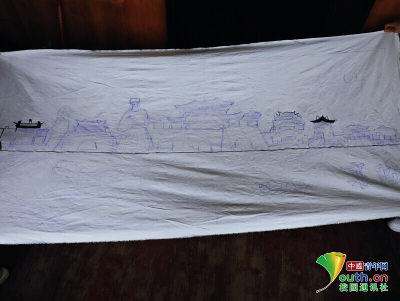 图为暑期实践团队所绘作品的初稿展示。以襄阳这座城市标志性建筑为主体,加上水流小船柔和整体古朴的氛围,上方以太阳和飞鸟作铺垫,减少留白的同时又让画面变得更加和谐,右下角的襄阳二字更是点题之笔。中国青年网 通讯员 徐静雯 摄