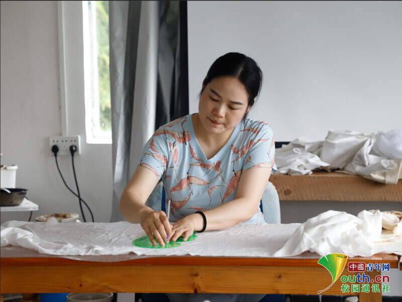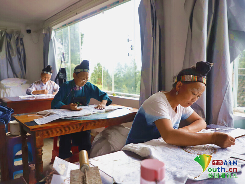 图为蜡染坊老师专心工作时的抓拍,她们所绘制的图案多为复杂的具有苗族特色的花鸟鱼虫。在熟练的操作下,给人以极大的视觉冲击。中国青年网 通讯员 徐静雯 摄