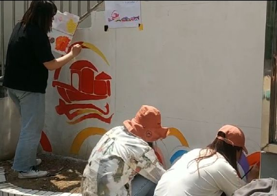 墙绘过程中,党员同学们表现出了极高的积极性与专业的绘画水准,专注着墙绘,一刻也没有松懈。期间还让学校的孩子们一起参与进来,党员同学引导着小朋友们一笔一笔在墙上进行创作,给党史园地注入了阳光活力。