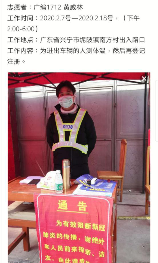 刘权龙同学每天风雨无阻,尽职尽责的登记每一辆车、每一个人,在小区门口一天值班就要值15个小时,但他还是坚持了下来,树立了无私奉献不求回报的理工人形象。