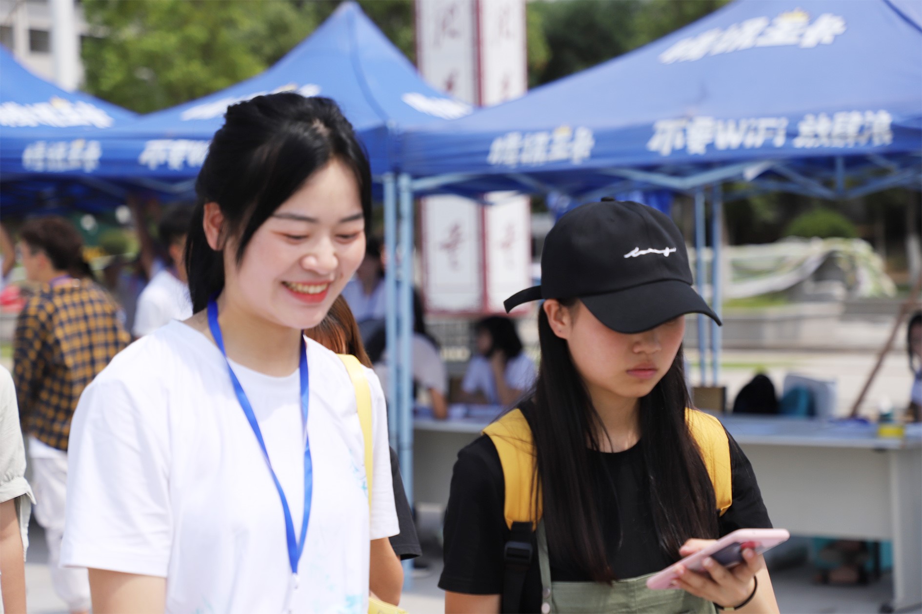 迎新现场,工作人员一丝不苟、精神饱满,热情接待陆续到达的新生及家长;戴着工作牌的学生志愿者四处奔走,热情洋溢,以最温暖的笑容,最真切的关心给新生以及家长提供帮助。他们自然接过新生手中的行李,仔细介绍报到流程。尽管烈日当空,但是只要能收获一声“谢谢”,心里也会涌起淡淡的成就感。