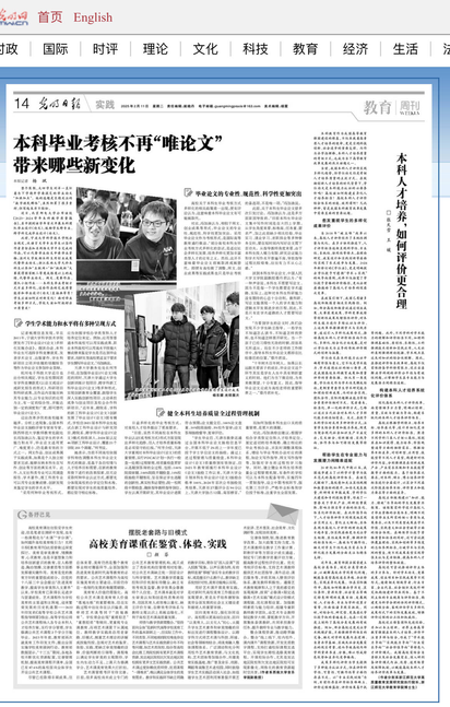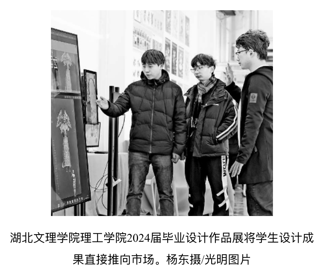 2月11日,《光明日报》发布《本科毕业考核不再“唯论文”带来哪些新变化》文章,我们“2024届毕业设计作品展将学生设计成果直接推向市场”照片被配图刊发。