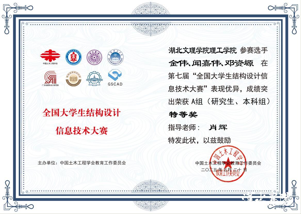 (建工学院 肖辉)在刚刚结束的第七届全国大学生结构设计信息技术大赛中,我们建工学子以扎实的专业功底与卓越的创新实践能力,在全国高校竞技舞台上勇创佳绩。荣获全国特等奖1项,全国三等奖3项,特别是特等奖需通过线上答辩直面专家评审,为赛事最高荣誉。本次比赛我们共有4组队伍参赛,所有参赛队伍全部获奖,刷新历史最好成绩!