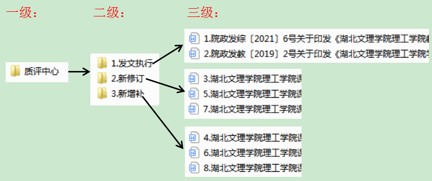 (2)所提交的电子版要求按部门、文件类型分级建立文件夹,最后一级制度文档按11月5日转设会议印发的文件目录做好相应编号,具体样式如下: