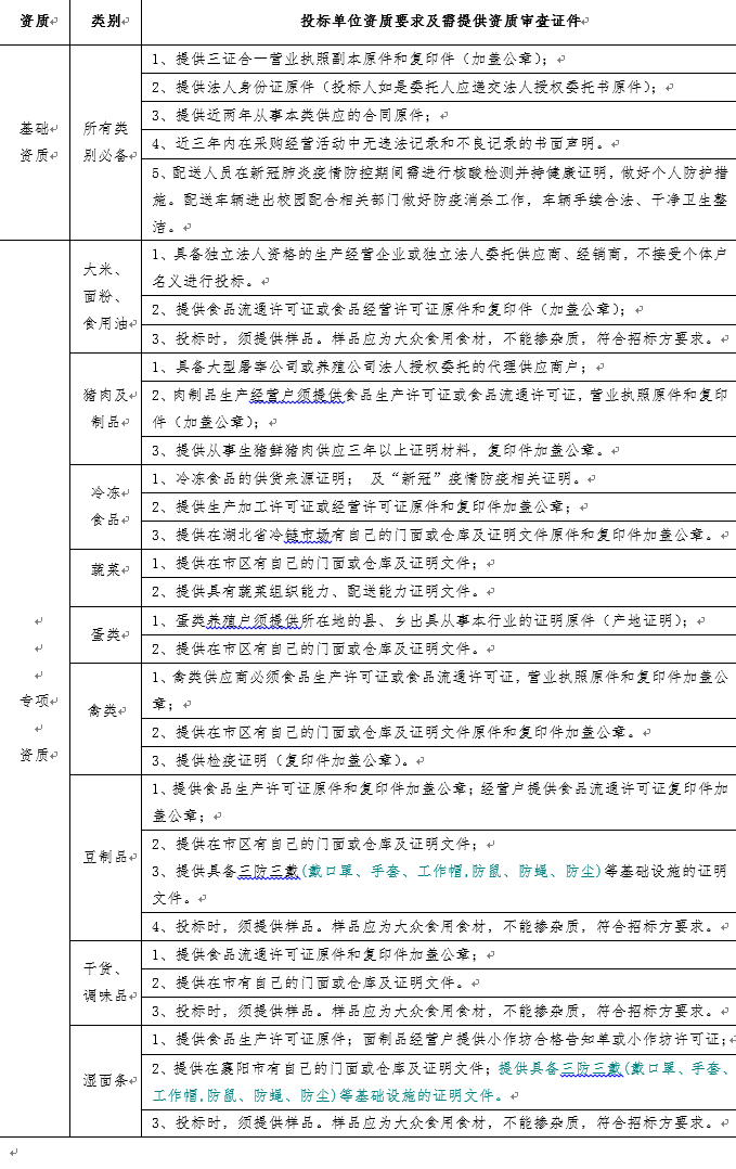 1.招标品种:大米、面粉、食用油、猪肉及制品、冷冻食品、蔬菜(包括蛋类、湿面条、豆制品)、禽类(包括鸡、鸭)、鱼类、干货调味品(包括食堂生产用低耗品)。